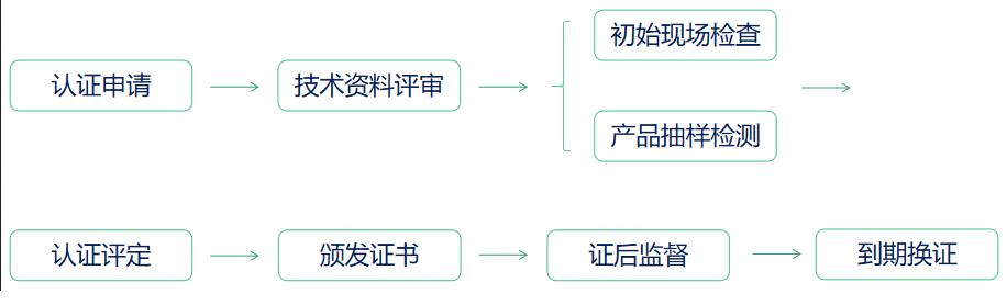 綠色產(chǎn)品認證的流程包括:申請——技術資料評審、受理——現(xiàn)場檢查、產(chǎn)品抽樣評審——認證決定——證書發(fā)放——證后監(jiān)督——到期換證