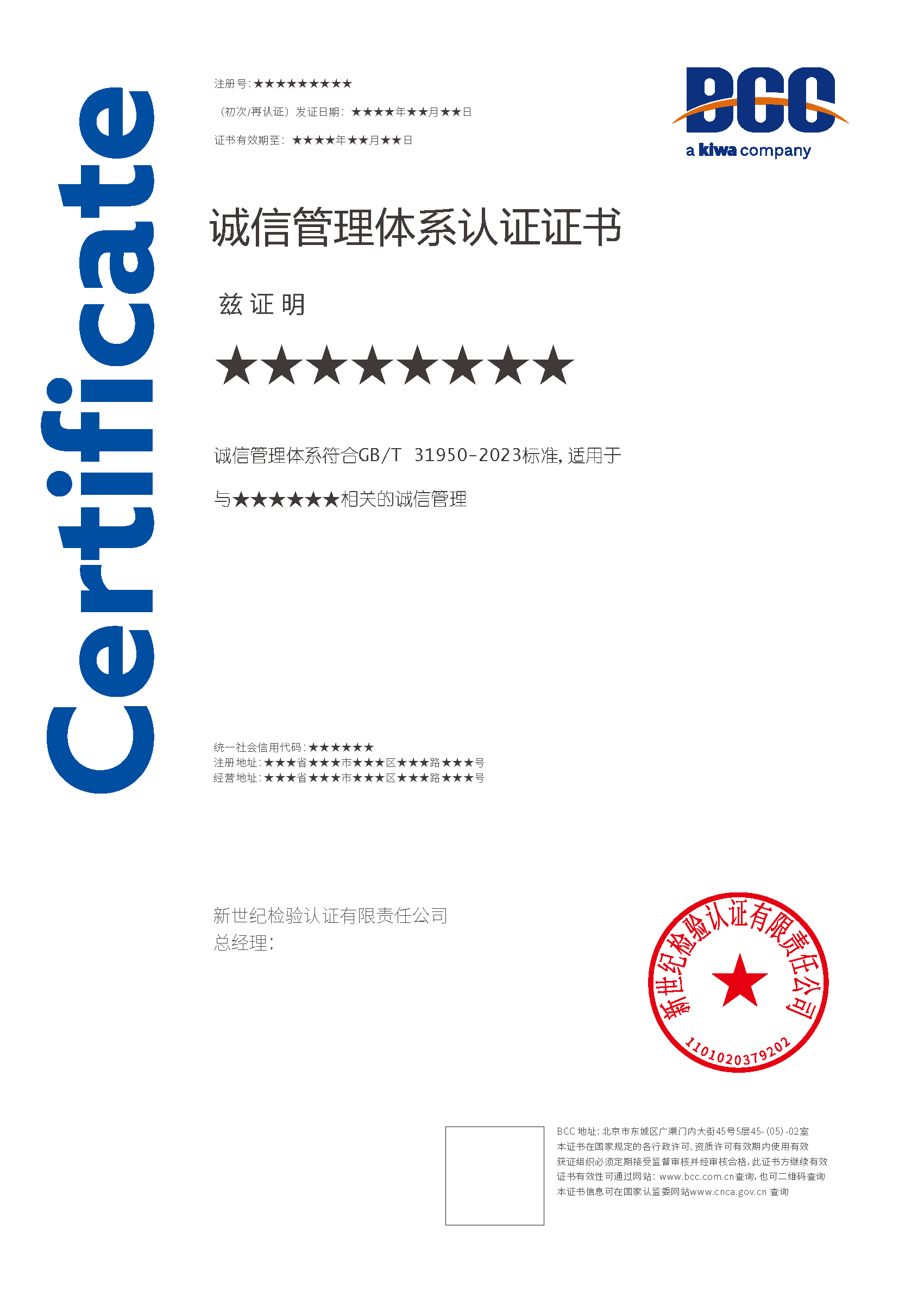 企業(yè)誠信管理體系認證是依據(jù)國家標準GB/T 31950-2023《企業(yè)誠信管理體系要求》對企業(yè)信用風險防范、控制和轉移的管理技術、業(yè)務操作及相關的制度安排進行審核的一種認證服務。
