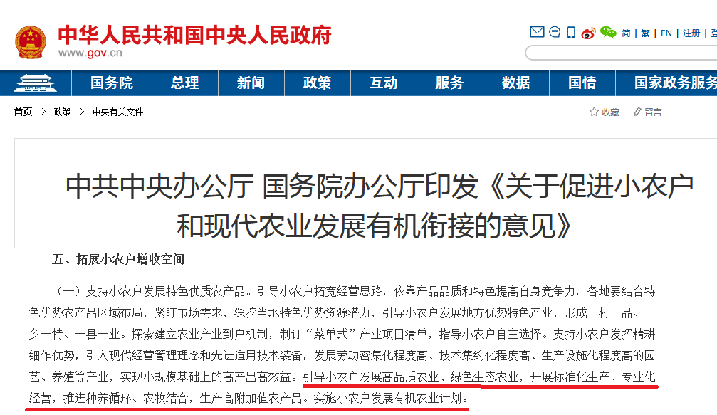 其中意見描述:“引導(dǎo)小農(nóng)戶發(fā)展高品質(zhì)農(nóng)業(yè)、綠色生態(tài)農(nóng)業(yè),開展標(biāo)準(zhǔn)化生產(chǎn)、專業(yè)化經(jīng)營(yíng),推進(jìn)種養(yǎng)循環(huán)、農(nóng)牧結(jié)合,生產(chǎn)高附加值農(nóng)產(chǎn)品。實(shí)施小農(nóng)戶發(fā)展有機(jī)農(nóng)業(yè)計(jì)劃。”