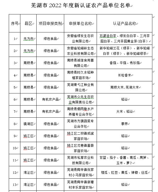 根據《蕪湖市農業(yè)農村局 蕪湖市財政局關于做好2022年省財政農業(yè)高質量發(fā)展(“兩強一增”行動)項目實施工作的通知》(市農計財〔2022〕60號)要求,經縣(市)區(qū)農業(yè)農村部門申報,市農業(yè)農村局審核,擬對蕪湖市2022年度新認證綠色食品、有機農產品、地理標志農產品的29家單位進行公示。如下圖: