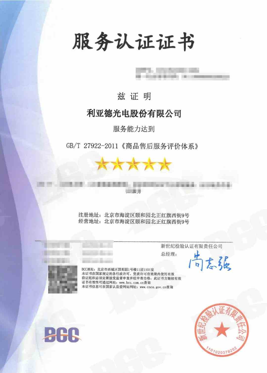 利亞德秉持“高品質(zhì)、優(yōu)服務、重誠信、盡職責、服務,一切讓顧客滿意”的經(jīng)營理念,不斷提升企業(yè)的產(chǎn)品質(zhì)量和服務質(zhì)量,以優(yōu)質(zhì)服務能力獲BCC頒發(fā)的商品售后服務認證五星證書,為未來進軍家電市場的戰(zhàn)略布局奠定了堅實基礎。