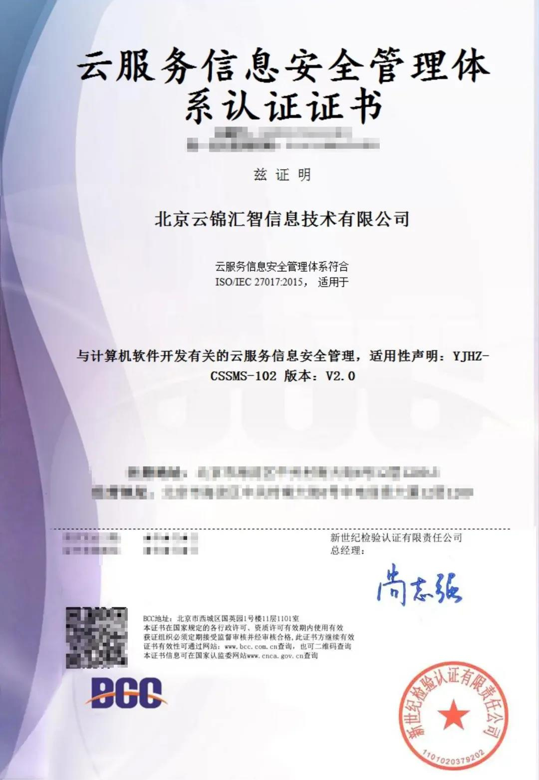 云錦匯智通過(guò) ISO27017云服務(wù)信息安全管理體系認(rèn)證