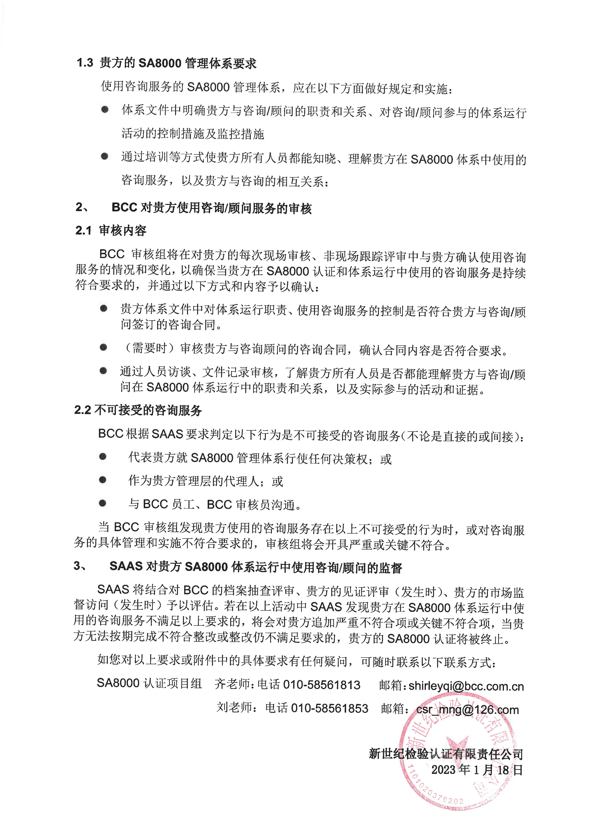該文件中對認(rèn)證機(jī)構(gòu)、SA8000已獲證客戶、新申請SA8000認(rèn)證的組織都提出了更具體的要求,這些要求將在2023年2月1日實(shí)施。以下就該文件中與貴方有關(guān)的內(nèi)容予以說明告知,BCC審核組也將自2023年2月1日開始在審核中向貴方了解、收集、確認(rèn)以下信息,請貴方提前知悉: