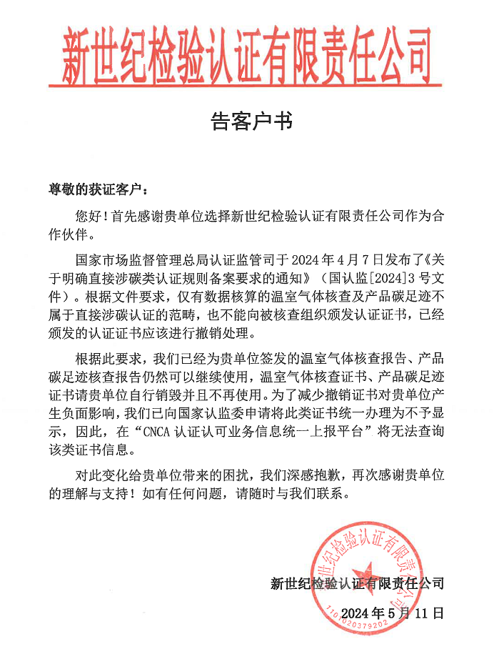 關(guān)于涉碳認(rèn)證情況告客戶(hù)書(shū)