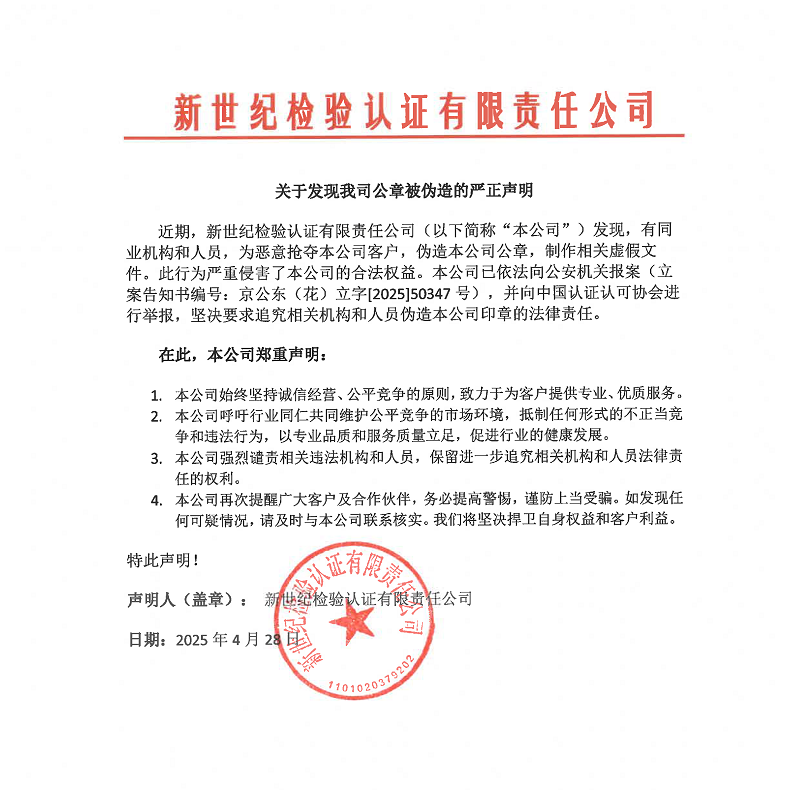 近期,新世紀(jì)檢驗(yàn)認(rèn)證有限責(zé)任公司(以下簡稱 “本公司 ” )發(fā)現(xiàn),有同業(yè)機(jī)構(gòu)和人員,為惡意搶奪本公司客戶,偽造本公司公章,制作相關(guān)虛假文件。此行為嚴(yán)重侵害了本公司的合法權(quán)益。本公司已依法向公安機(jī)關(guān)報(bào)案(立案告知書編號(hào): 京公東(花)立字[2025]50347號(hào)),并向中國認(rèn)證認(rèn)可協(xié)會(huì)進(jìn)行舉報(bào),堅(jiān)決要求追究相關(guān)機(jī)構(gòu)和人員偽造本公司印章的法律責(zé)任。