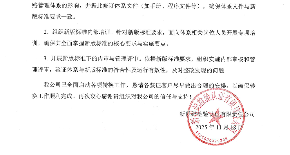 3.自2026年1月1日起,我公司將不受理舊版標準的申請(包括初審、監(jiān)督和再認證申請)。所有舊版標準客戶應(yīng)在2026年12月31日前完成標準轉(zhuǎn)換,2026年12月31日后,對仍未完成換發(fā)新版標準的認證證書,我公司將作出暫?;虺蜂N認證證書處理。