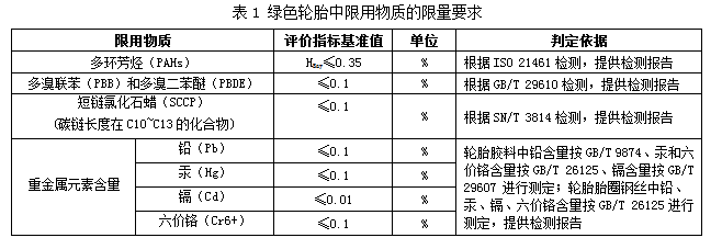 3、環(huán)境屬性。參照已發(fā)布并實(shí)施的《輪胎中限用物質(zhì)的限量要求》國家標(biāo)準(zhǔn),對(duì)輪胎胎面、胎側(cè)、胎圈(除鋼絲以外部分)、三角膠、內(nèi)襯層、內(nèi)胎、墊帶、胎圈鋼絲等各部位的多環(huán)芳烴(PAHs)、重金屬(鉛、汞、鎘、六價(jià)鉻)、短鏈氯化石蠟(SCCP)、多溴聯(lián)苯(PBB)和多溴二苯醚(PBDE)等限用物質(zhì)提出了要求,具體評(píng)價(jià)指標(biāo)基準(zhǔn)值及判定依據(jù)詳見表1。